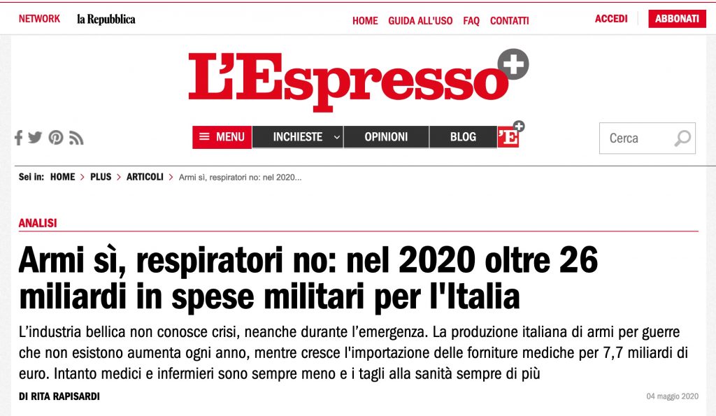 Le spese militari in Italia crescono da anni, così come i tagli alla sanità. E adesso che mancano ventilatori, posti letto, mascherine e reagenti, è ancora più difficile da accettare. Già perché le forniture mediche dell’Italia dipendono per lo più dall’estero: con quello che produciamo non copriamo neanche il 50 per cento del fabbisogno, per questo importiamo apparecchi elettromedicali per 1,2 miliardi e attrezzature medico-dentistiche per 6,5 miliardi l’anno. Mentre importiamo armamenti per meno di cinquecento milioni.