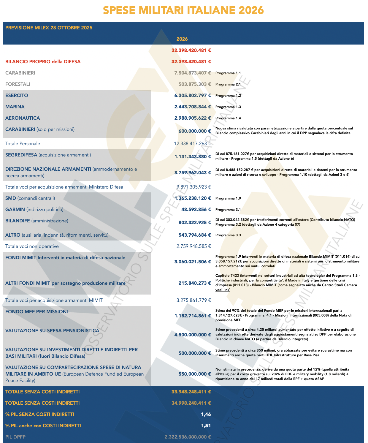 NB Come sempre per le valutazioni previsionali di spesa militare condotte dall’Osservatorio Mil€x in questa analisi vengono tenute in considerazione le cifre di Competenza per l’anno 2026, non quelle relative ai flussi di cassa