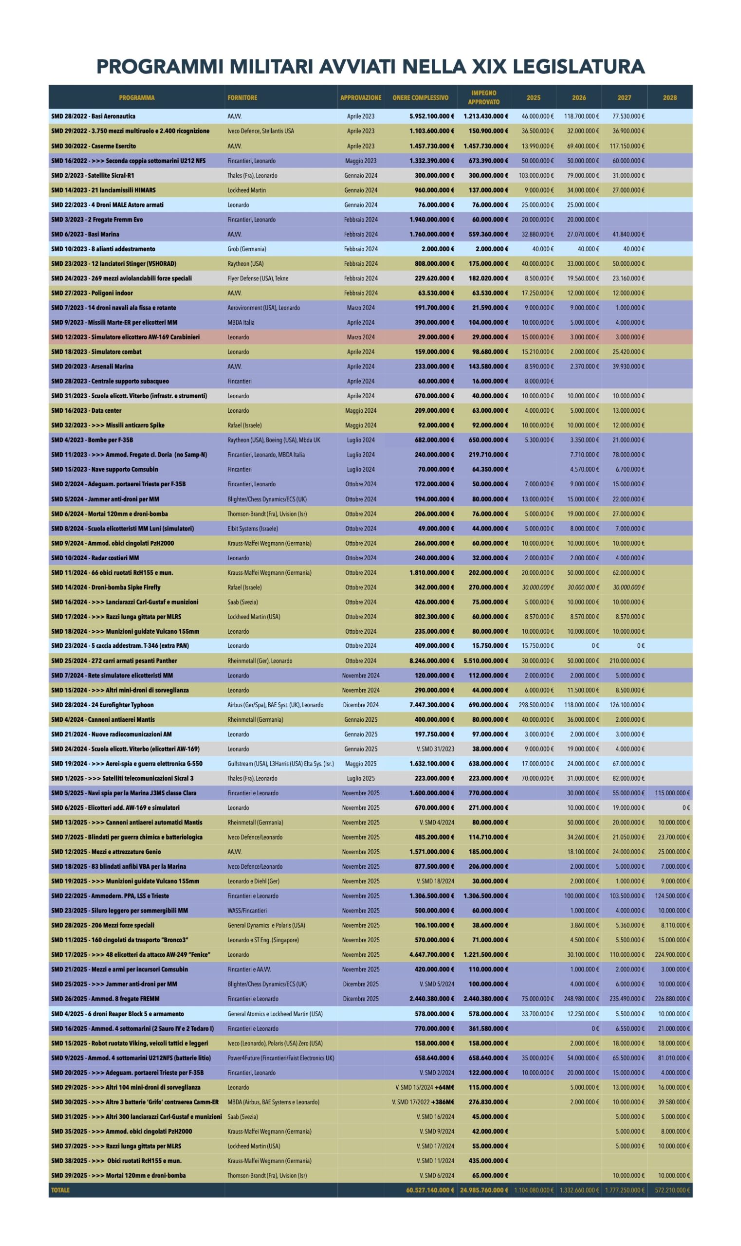 Scarica qui il PDF con la lista di tutti i programmi d’armamento approvati nel corso della XIX Legislatura (aggiornati al 18 dicembre 2025)