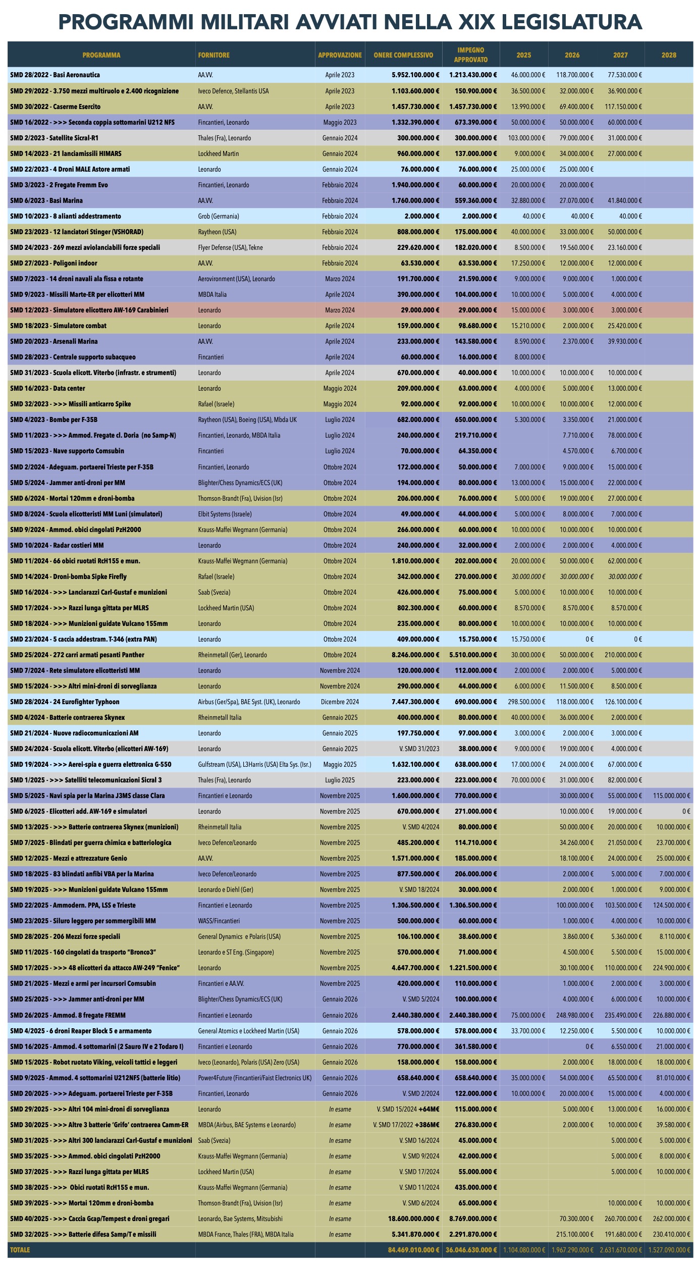 Il programma di armamento per i missili Sampt-T Camere allunga la già corposa serie di atti governativi per procurement militare trasmessi dall’Esecutivo dagli ultimi mesi del 2025 in poi, portando a 36 miliardi il totale degli impegni finanziari pluriennali dei 76 provvedimenti messi sul tavolo del Parlamento nel corso della XIX Legislatura. Quasi la metà di tale somma, 16,5 miliardi, riguarda i 16 programmi di riarmo in approvazione dall’inizio di quest’anno.